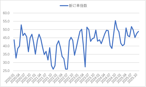 市场需求略有回暖,行业增长动能仍显不足。11月份是钢铁行业由传统旺季向淡季过渡的阶段,部分重点基建和房屋建筑项目为赶工期加快推进,南方地区施工条件相对稳定,加上制造业对重点原材料的需求保持相对稳定,钢材需求呈现小幅回暖态势。但房地产行业整体仍偏弱运行,新开工面积持续下滑,项目资金到位率有所趋缓,对钢铁需求的拉动作用有限。在这些因素影响下,国内钢市需求释放仍不充分,行业增长动能依旧偏弱。新订单指数为 48.9%,环比上升1.3个百分点,延续回升态势,但仍运行于收缩区间,显示当前需求端略有回暖,但整体恢复力度仍然较弱。出口方面也有所波动,由于海外市场需求整体较为疲软,加上国际贸易环境趋紧,我国钢铁出口有所收缩,新出口订单指数在上月上升至扩张区间后再次回落到50%以下。终端需求方面,据上海卓钢链了解,11 月国内终端需求略有改善,以沪市终端线螺采购为例,11月环比小幅回升9.1%,表现尚可。