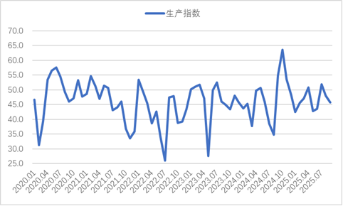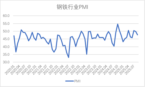 从中物联钢铁物流专业委员会调查、发布的钢铁行业 PMI 来看,2025年9月份为47.7%,环比下降2.1个百分点,连续2个月环比下降,钢铁行业旺季特征并未显现。分项指数变化显示,钢铁需求趋弱运行,钢厂生产继续放缓,产品库存有所累积,原材料价格继续高位运行,钢材价格小幅震荡。预计10月份,钢铁需求有所回升,钢厂生产有所增加,原材料价格高位震荡,钢材价格有所上升,钢厂对后市预期持续乐观。